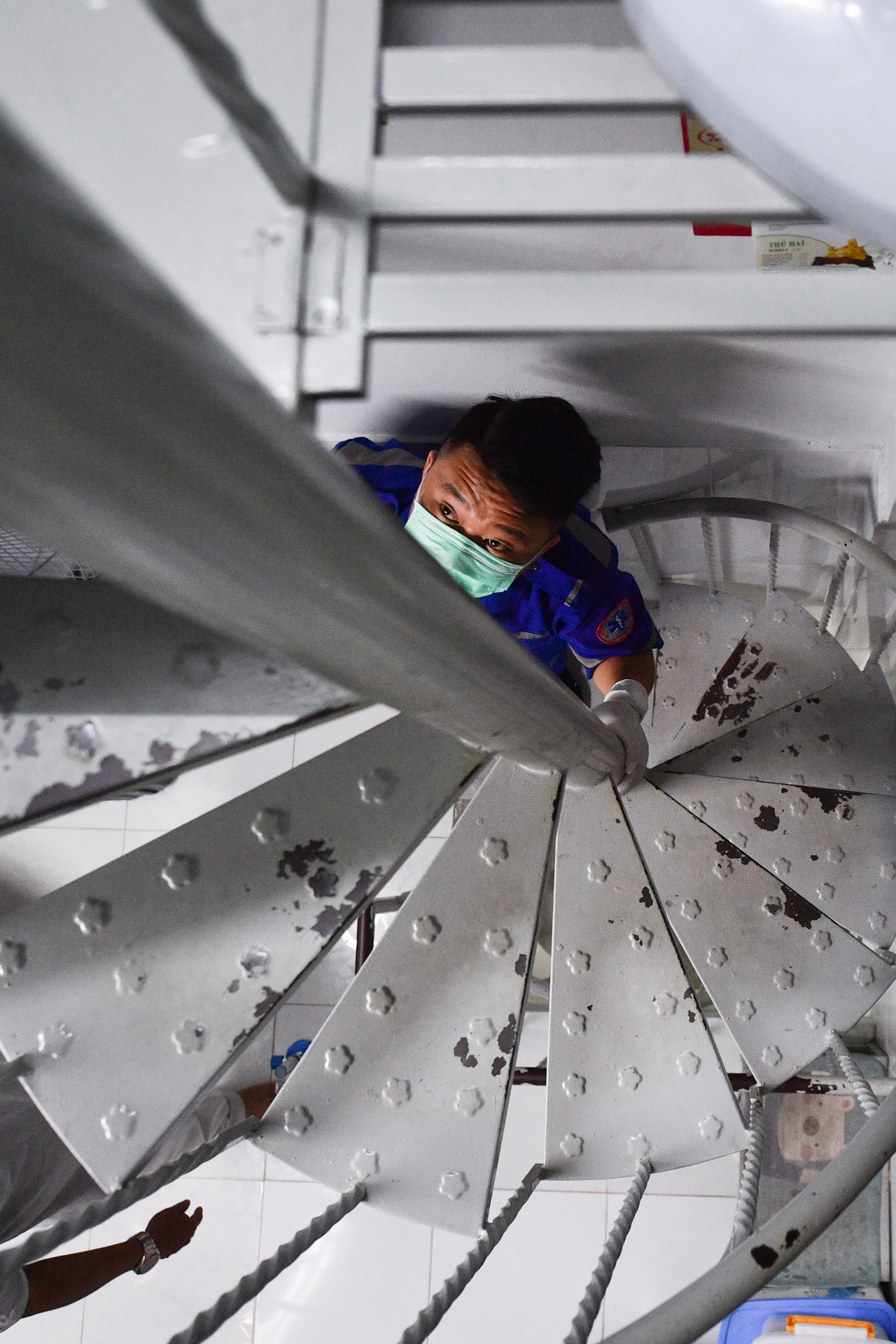 | Chúng tôi quyết định động viên và hướng dẫn cô ấy tự xuống cầu thang. Điều dưỡng Tôn xuống trước đưa tay đỡ bệnh nhân. Tôi nhích từng bước theo sau, người cô ấy run run mỗi khi cử động. |