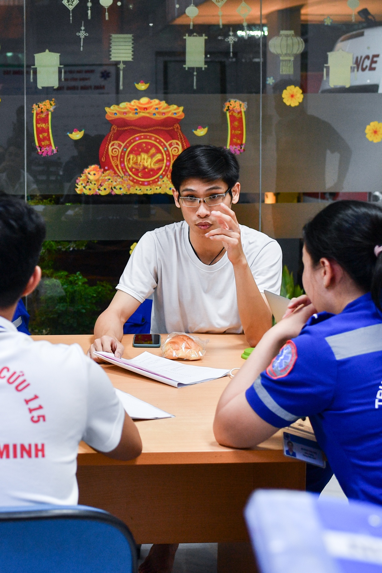 | Trung tâm Cấp cứu 115 lúc này chỉ còn 6 bác sĩ và điều dưỡng trực cấp cứu. Gần 0h, chúng tôi ăn chút đồ ăn nhẹ và ngồi nghỉ ngơi tại phòng điều hành. Mọi người trò chuyện, tranh thủ kể với nhau về những tình huống cấp cứu đã trải qua hôm nay. |