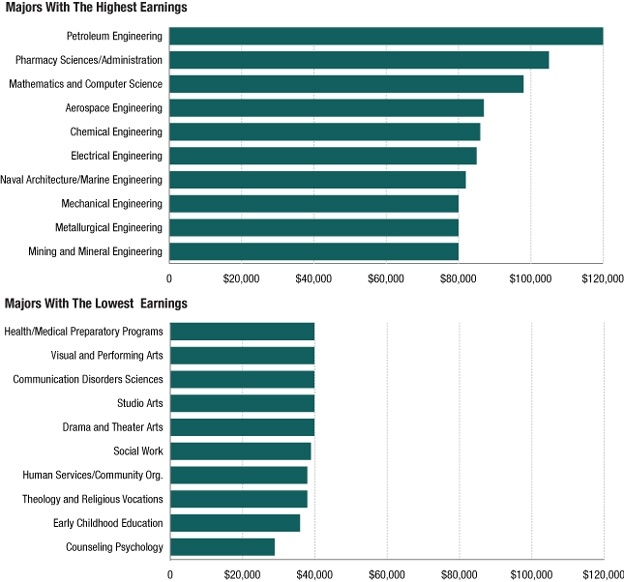 Những ngành có thu nhập cao nhất là: kỹ thuật Dầu khí, Dược, Khoa học máy tính và toán học, kỹ thuật vũ trụ, kỹ thuật hóa học, kỹ thuật điện, kỹ thuật hàng hải/ kiến trúc hải quan, kỹ thuật máy, kỹ thuật luyện kim, kỹ thuật mỏ và khoáng sản.