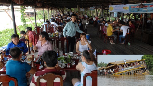 | Nhà hàng Dìn Ký Cầu Ngang bây giờ (ảnh lớn) và vụ chìm tàu Dìn Ký năm 2011 (ảnh nhỏ). |