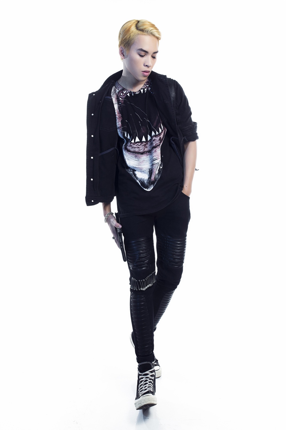Chàng trai nhỏ tuổi nhất Fashionista Vietnam - Tôn Chí Long - từng là hot boy của The Voice Kids 2013 vượt qua phần chụp ảnh của mình với hình ảnh mạnh mẽ, nam tính. Set trang phục tối màu, hầm hố khiến thí sinh này trông chững chạc hơn so với vẻ baby vốn có. Để phù hợp với set trang phục hơi hướng rock-chic, Chí Long không ngại đổi màu tóc line trắng ấn tượng. Vào đây để bình chọn cho thí sinh.