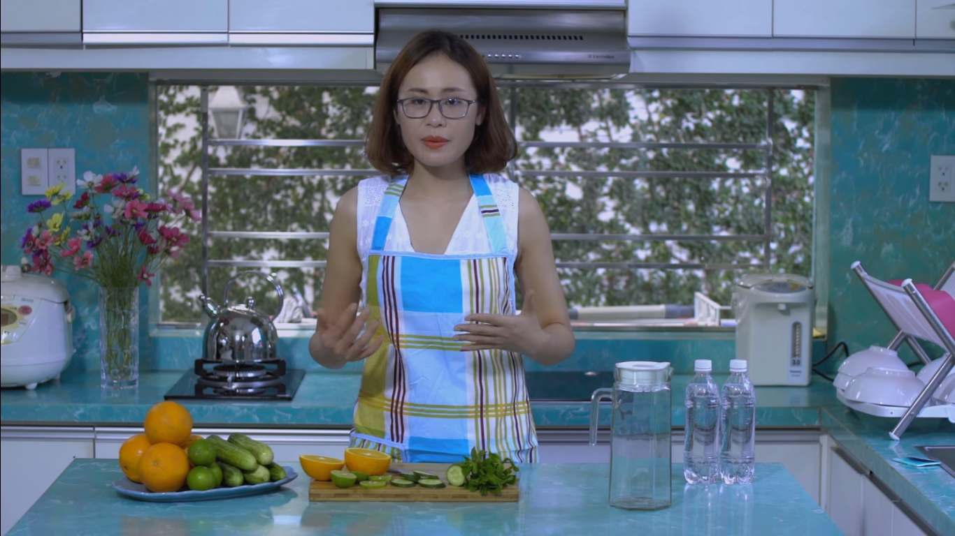 Với Mailovesbeauty, nước detox được kết hợp từ dưa chuột, cam và lá bạc hà giúp làm sạch gan, làm mới hệ tiêu hóa. |