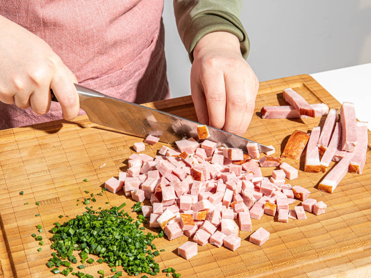 - Cắt thịt nguội theo hình lập phương.