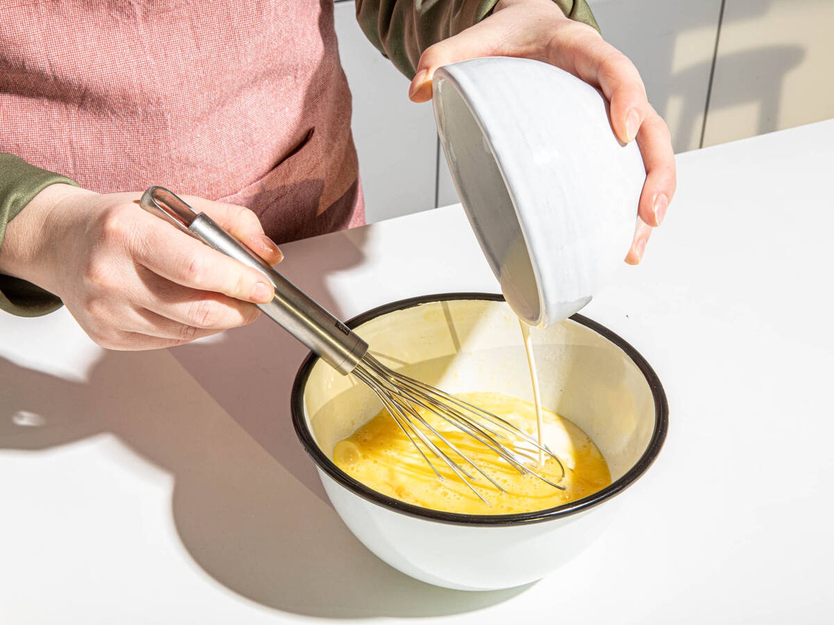 - Đánh trứng trong tô đến khi nổi bọt.