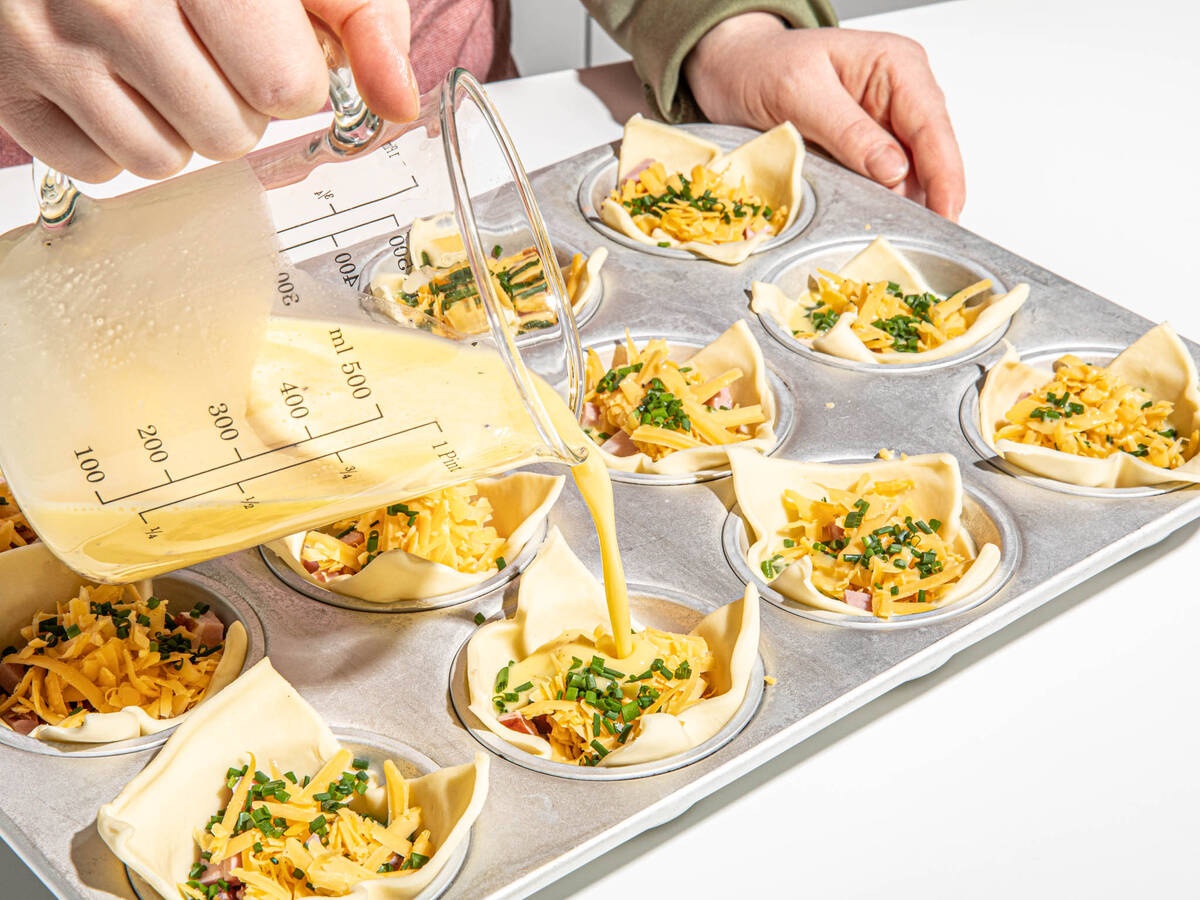 - Chia đều thịt nguội, phô mai và lá hẹ vào giữa các khuôn bánh.