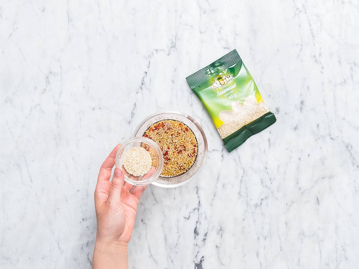 - Trộn gừng, ớt với giấm gạo, nước tương, dầu mè, mật cây thùa, nước cốt chanh và hạt mè trong một cái bát.
