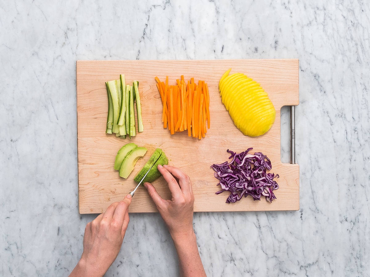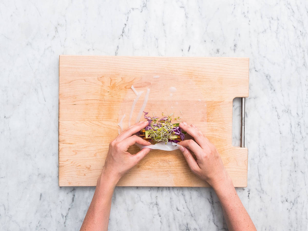 - Đặt lần lượt các thành phần (ngoại trừ nước sốt) trên bánh tráng. Gấp một mặt bánh tráng lên trên mặt nhân, sau đó gấp những cạnh còn lại sao cho mọi mặt bánh tráng bao bọc phần nhân.
