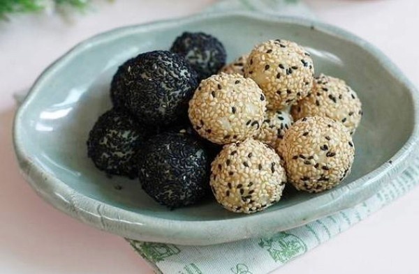 | Mè rang chín, lăn những viên khoai tròn qua lớp mè đen, mè trắng cho mè bám kín mặt viên khoai là xong. |
