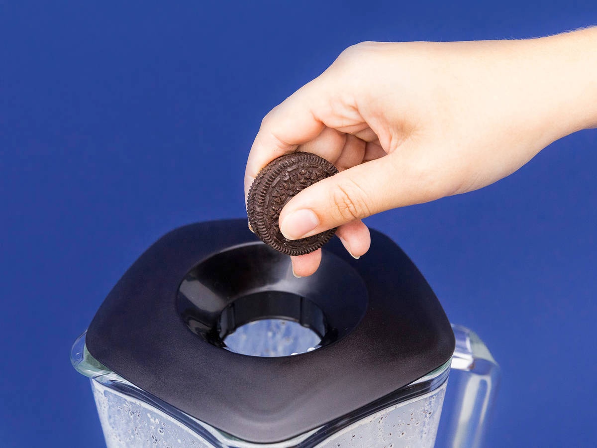 - Tiếp tục cho một cái bánh quy oreo vào máy xay sinh tố và xay đến khi mịn.