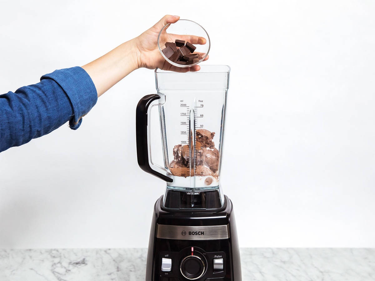 - Cho kem chocolate, nước cốt dừa, bột cacao không đường và chocolate đắng vào máy xay sinh tố, xay đến khi mịn.