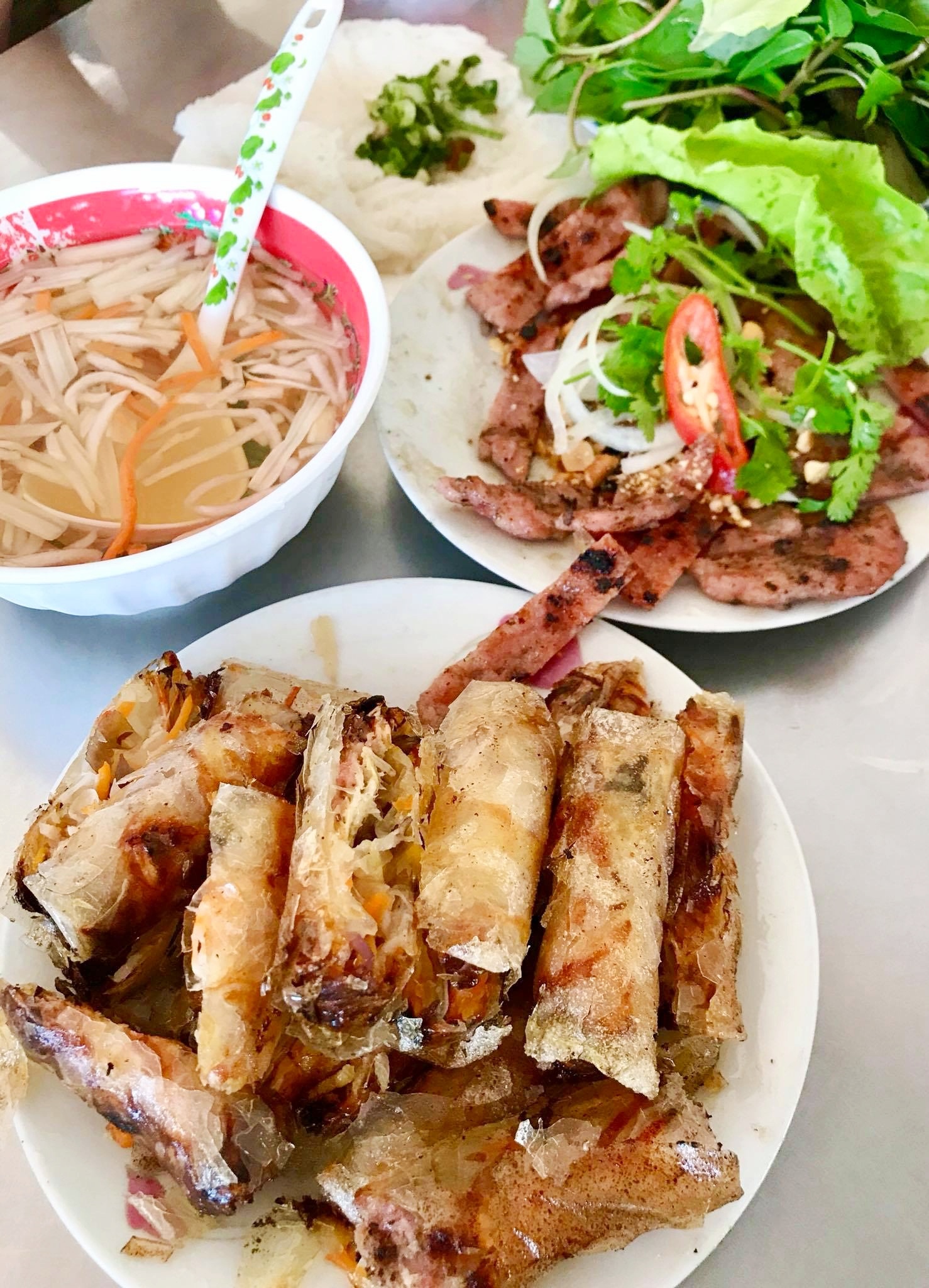 Đặc sản bánh hỏi An Nhứt thường có những thành phần ăn kèm như thịt heo xiên que nướng, chả giò nhân tôm, thịt chiên giòn, nước chấm pha chua ngọt, cà rốt, ngó sen, củ cải trắng ngâm, dưa leo, rau thơm... Khi ăn, bạn có thể trải miếng bánh tráng mỏng, xếp rau, dưa, đặt thêm lớp bánh hỏi rồi cho thịt nướng, chả giò cuốn lại, chấm nước mắm pha. Ảnh: Dinhminh.duong.3. |
