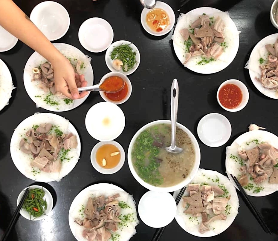 Ở Bình Định, Phú Yên, người ta thường phục vụ bánh hỏi lòng heo cùng với cháo huyết nấu loãng, có rắc chút hành, tiêu dậy mùi thơm hấp dẫn. Phần cháo nóng đi kèm này sẽ giúp thực khách thêm ấm bụng, ngon miệng hơn. Ảnh: Tiara.010. |