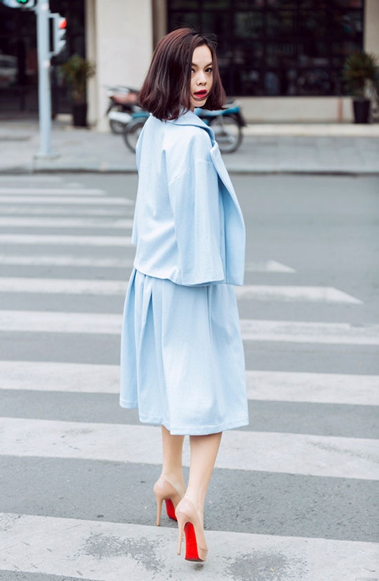 Màu xanh thanh bình: Cùng với màu hồng thạch anh thì màu xanh thanh bình cũng chiếm được lòng không ít tín đồ thời trang thế giới. Năm 2016, dự báo gam màu này sẽ bụng nổ mạnh mẽ ở mọi ngóc ngách của thời trang. Cũng là gam màu pastel nên màu xanh thanh bình vừa mát mẻ, nhẹ nhàng lại quyến rũ. Hoàng Thùy Linh thanh lịch và không kém phần cuốn hút với chân váy màu xanh thanh bình phối cùng áo crop top. |