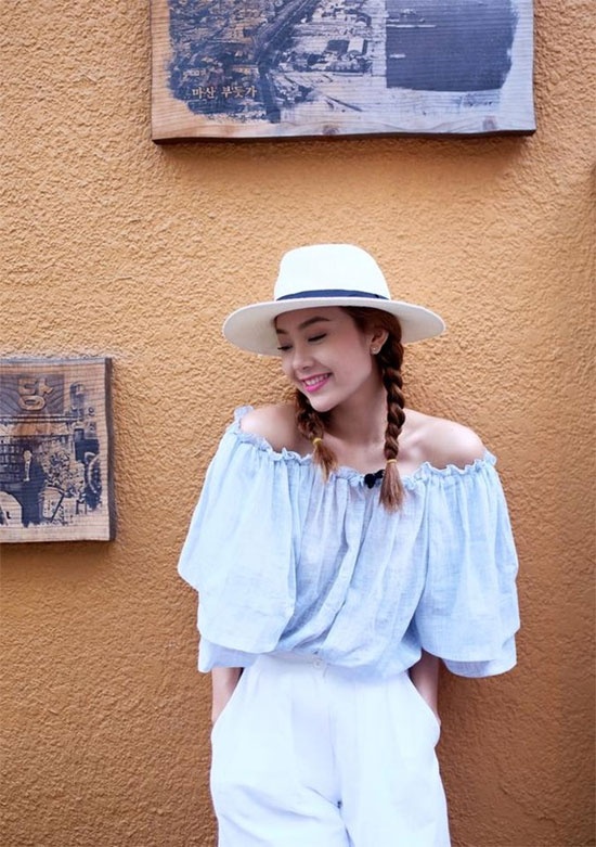 Một chiếc áo trễ vai màu xanh thanh bình giống Minh Hằng sẽ đủ giúp bạn làm giới mày râu phải say đắm. |