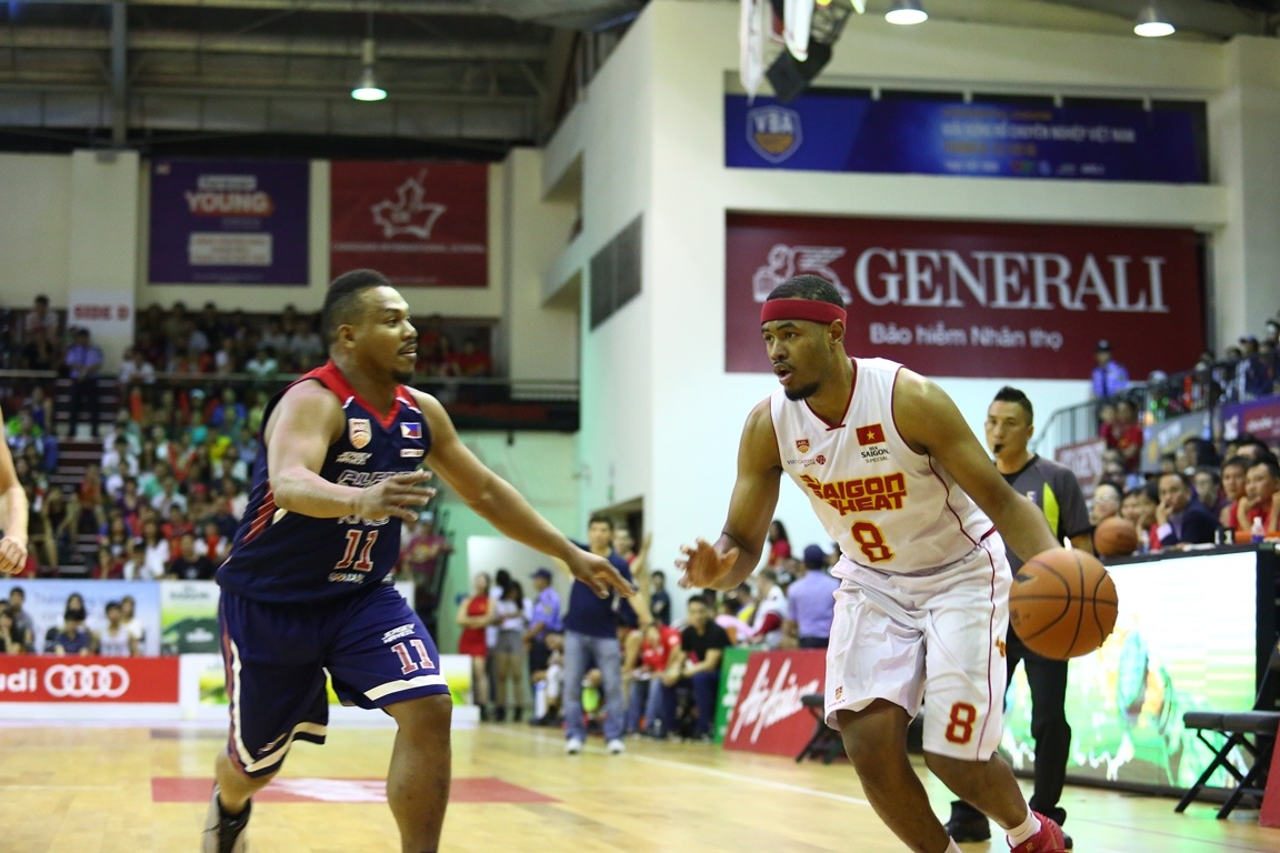 Moses Morgan (số 8) cùng Saigon Heat tạo nên một trận đấu đầy cảm xúc trước HiTech Bangkok City . |