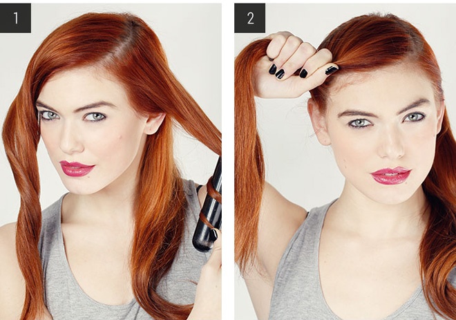 | Bắt đầu bằng cách rẽ tóc thành 3 phần. Dùng máy tạo kiểu uốn lọn xoăn to cho từng phần tóc. Lấy tay gom phần tóc mái sang bên. |