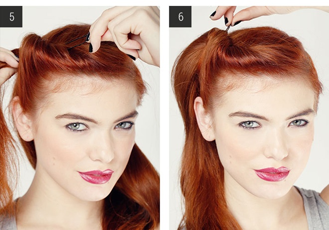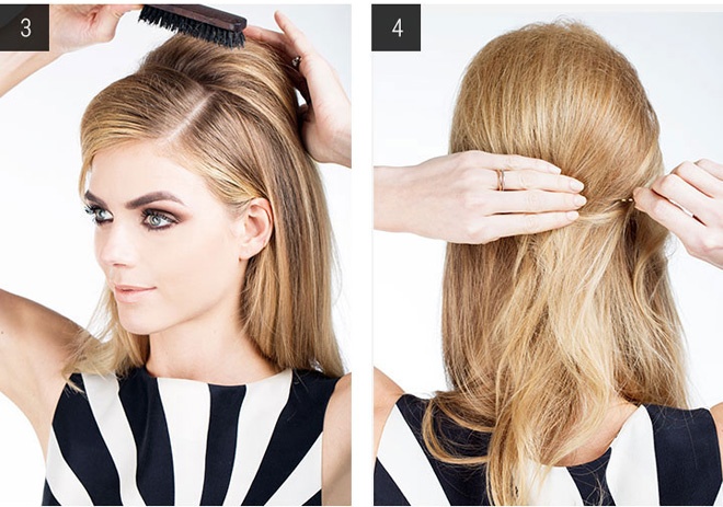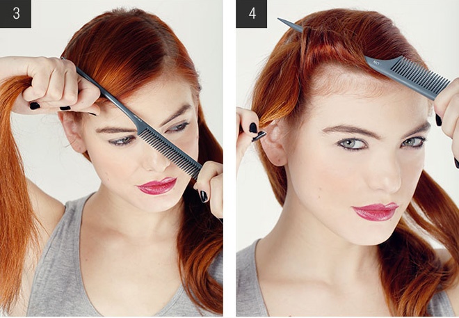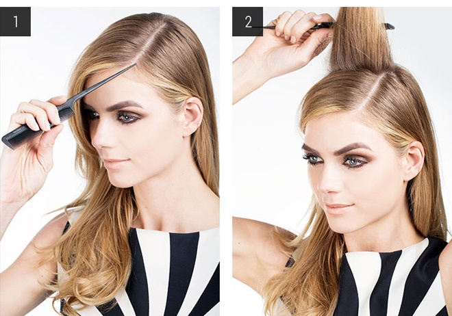 | Để thực hiện kiểu tóc vintage, bạn nên chia tóc ra thành 2 phần không đều nhau. Chọn một ít tóc ở đỉnh đầu và dùng lược tạo độ phồng cho phần tóc này. |