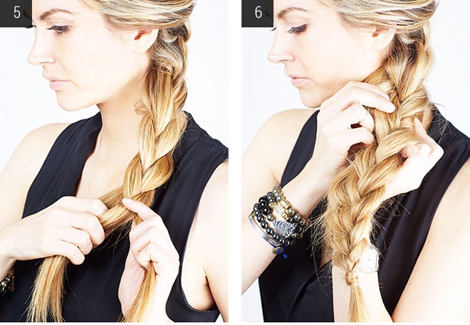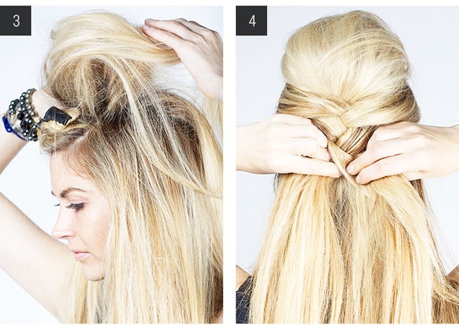 | Tạo độ phồng cho phần tóc ở đỉnh đầu bằng tay và lược. Cố định tóc phồng bằng kẹp tăm. Tiếp tục thắt bím chân rết cho phần tóc còn lại. |