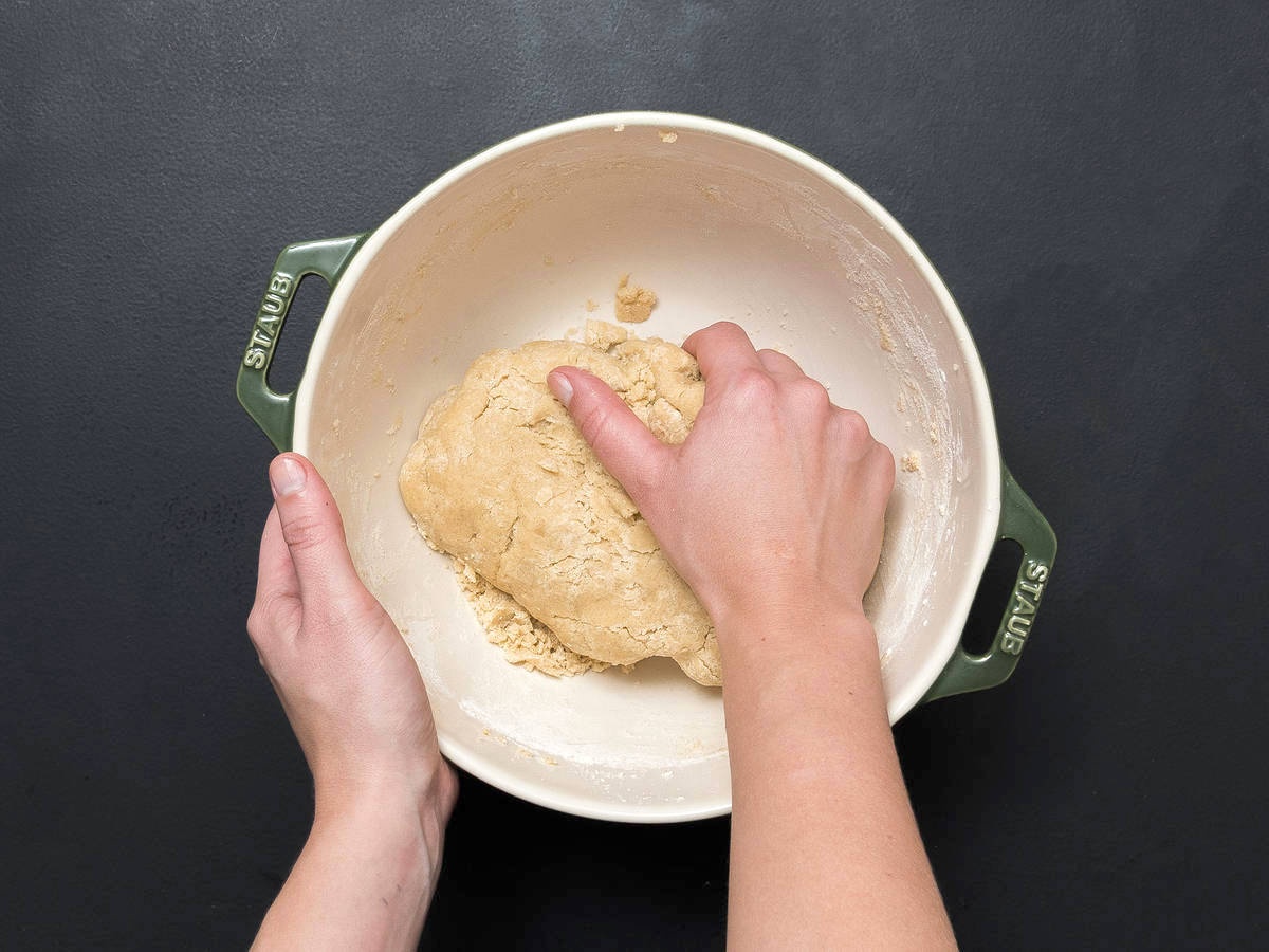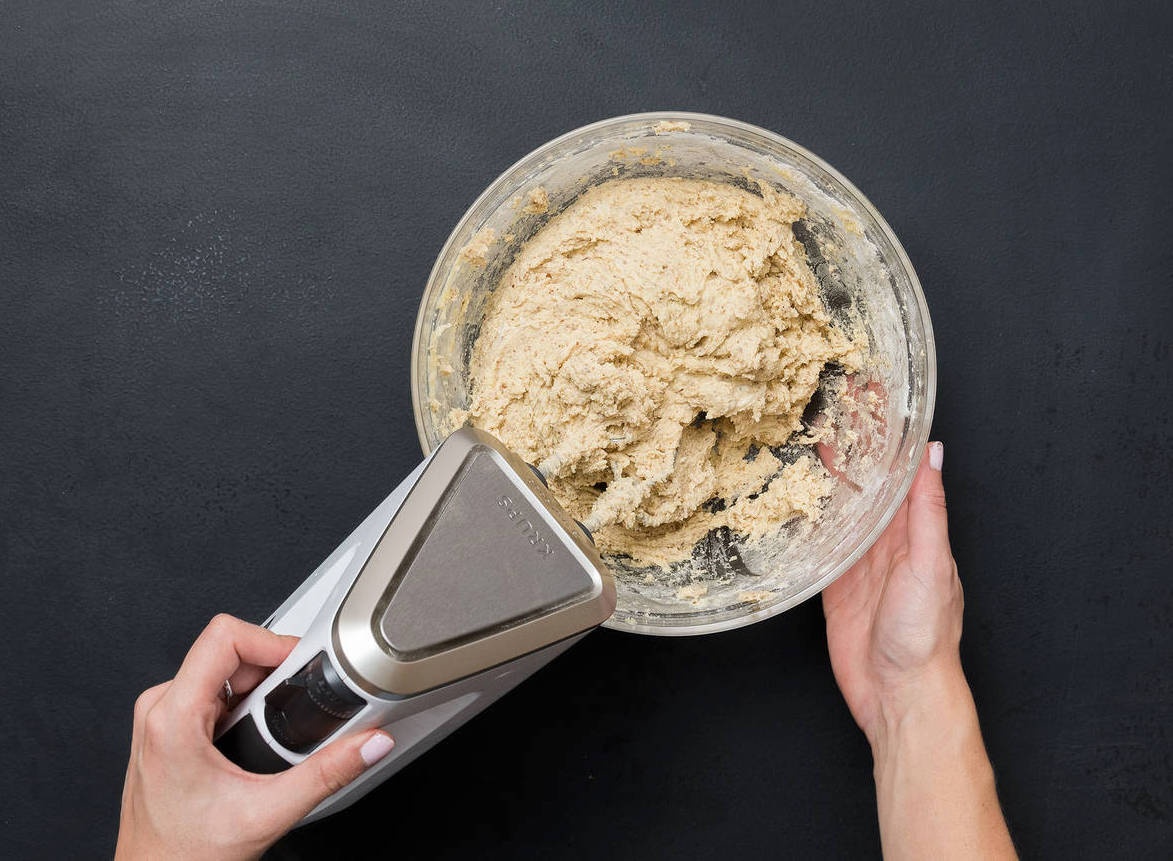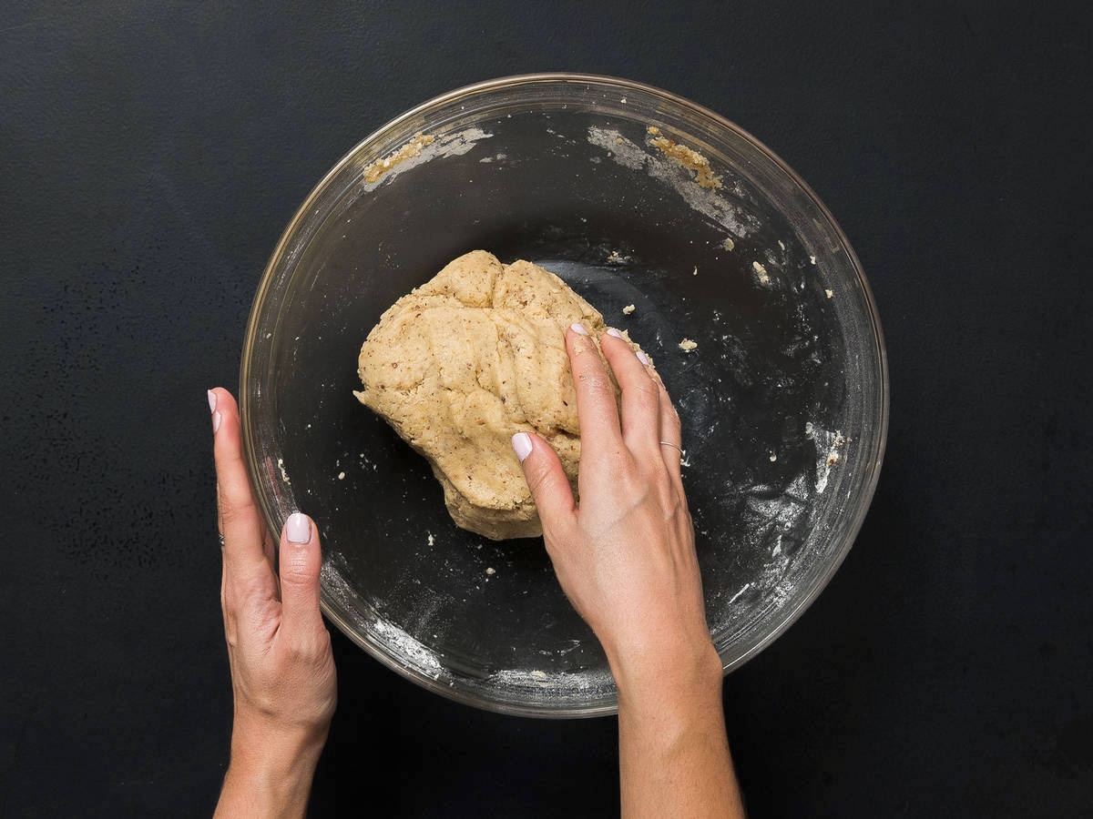 - Sử dụng một tô lớn khác, trộn bột mì và hạnh nhân (đã xay), thêm hỗn hợp bơ trứng (đã làm ở bước 1) vào mỗi lần một ít để tạo thành khối bột mịn.