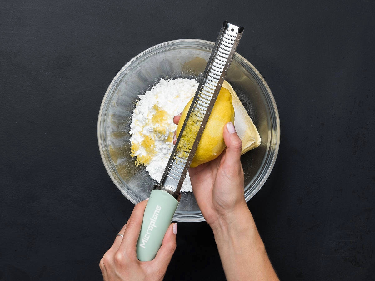 - Cho bơ, đường bột, đường vani, muối và vỏ chanh vào một bát lớn và đánh khoảng 5 phút cho tan.