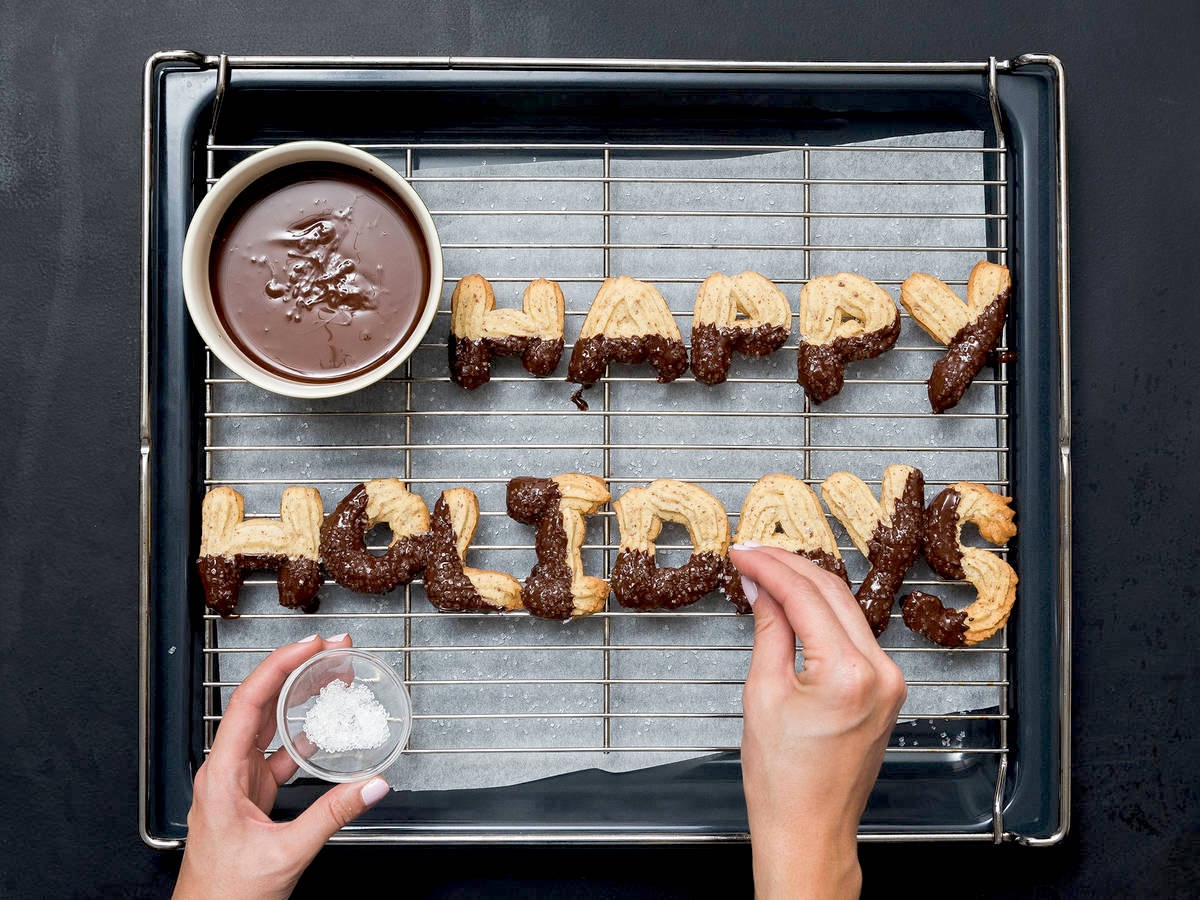 - Nhúng 1/2 của mỗi chiếc bánh quy vào phần chocolate đã đun chảy và để khô trên giá đựng bánh là hoàn thành.