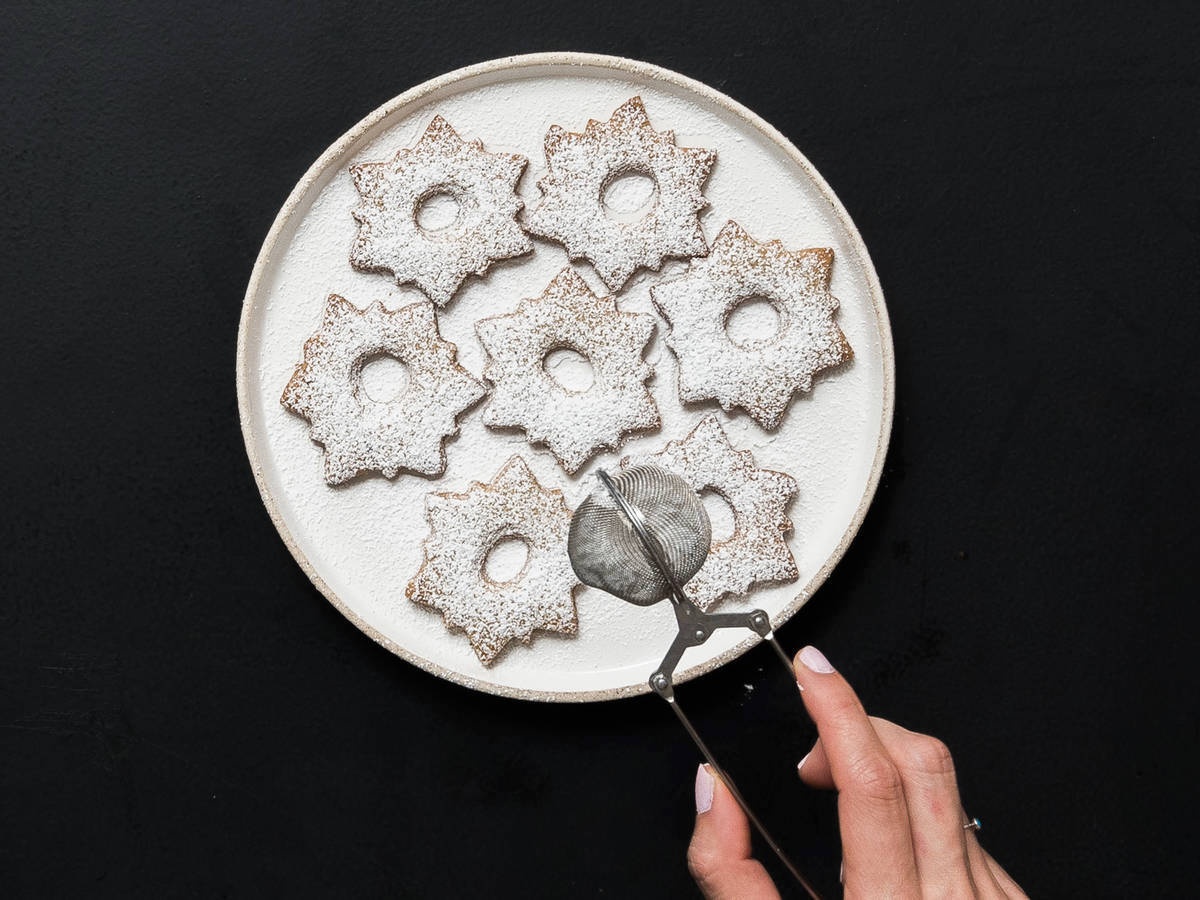 - Khi bánh quy đã nguội hoàn toàn, phủ một lớp đường bột lên phần bánh quy có khoét lỗ.