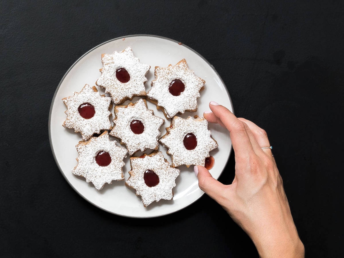 - Thêm nửa muỗng mứt vào giữa bánh quy (không khoét lỗ). Đặt bánh quy (có khoét lỗ) đã phủ đường bột lên trên và nhẹ nhàng ấn xuống.