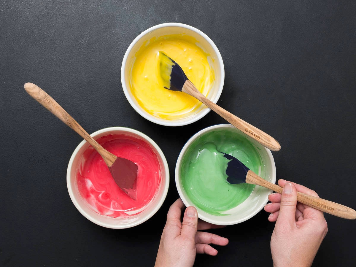 - Chia hỗn hợp trên vào 3 bát riêng biệt và thêm vào mỗi bát một màu thực phẩm khác nhau.