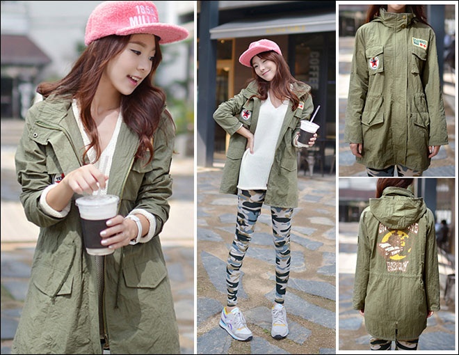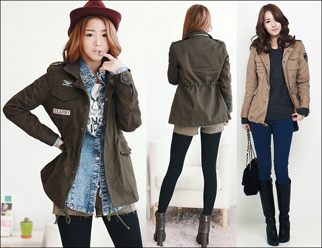 Không nhu mì và dịu dàng như style thường thấy của nàng thu, áo khoác quân đội mang đến một làn gió thời trang sôi nổi và cá tính mạnh mẽ, một sự kết hợp giữa nét nam tính bụi bặm với vẻ gợi cảm hút hồn trong bộ trang phục của phái đẹp, đi cùng áo khoác quân đội là giày boot hoặc túi xách bản lớn. Tại yes24, các mẫu áo của thương hiệu Envy Look, Miastylish được yêu thích hơn cả.