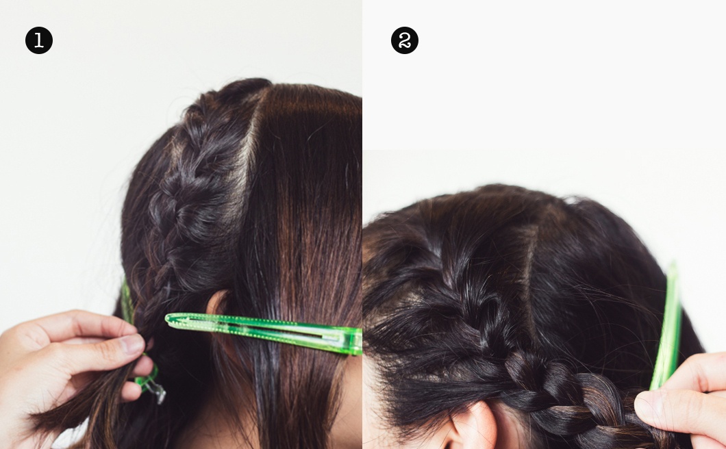 Trước tiên bạn rẽ tóc lệch, sau đó dùng kẹp cố định lại phần mái đã được kéo lệch sang một bên. Sau đó lấy phần tóc hai bên thái dương, lần lượt tết kiểu Pháp và cột thun lại.