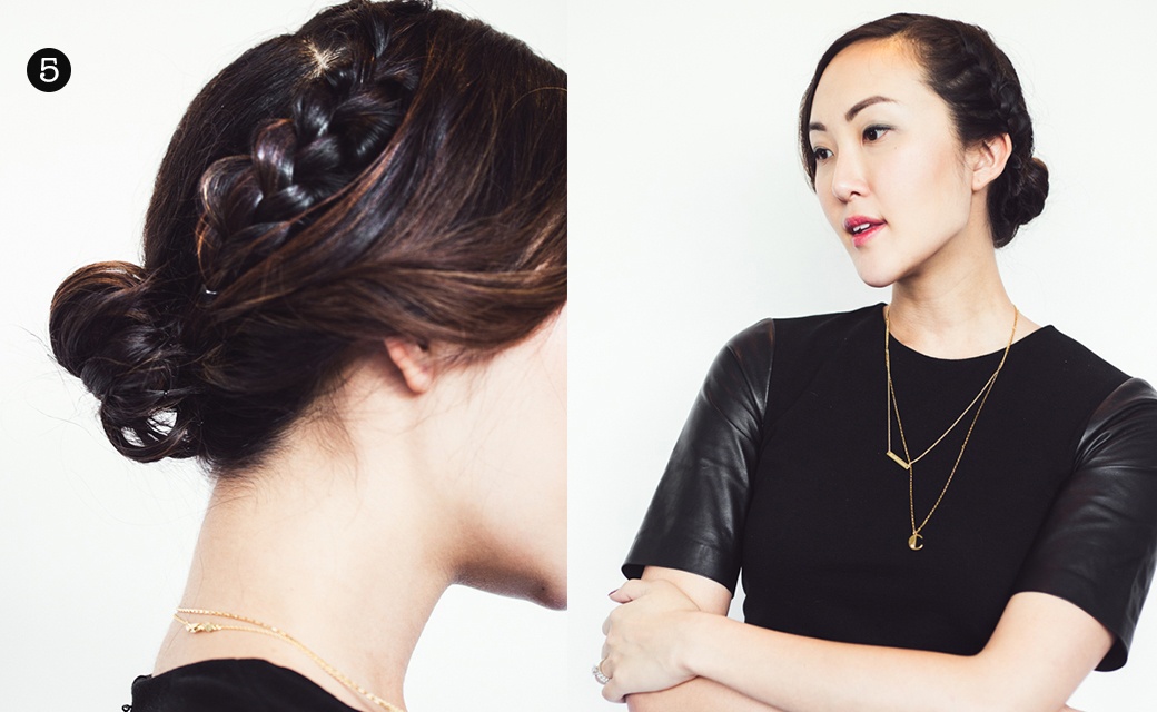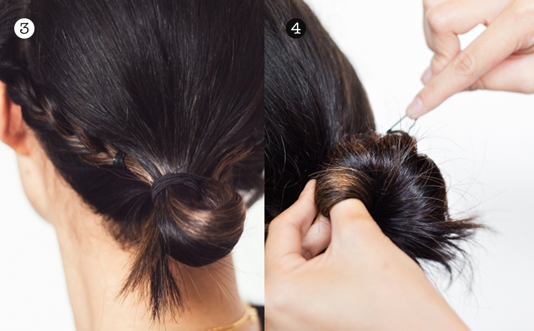 Vuốt toàn bộ tóc ra sau, buộc túm lại với thun đen và gập chân tóc vào trong. Sử dụng một chiếc kẹp để tạo hình thành búi tóc tròn. Kẹp ghim cố định nếp tóc.