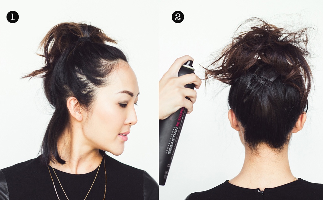 Với mẫu tóc này, bạn buộc tóc đuôi ngựa thật cao, phần tóc dưới gáy còn thừa hãy dùng kẹp ghim để vén hết tóc lên. Sử dụng gôm tạo kiểu để làm phồng phần tóc trên đỉnh.