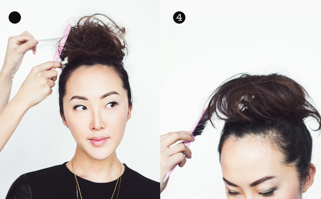 Dùng lược tạo kiểu để tạo thành một búi tròn rối trên đỉnh đầu.