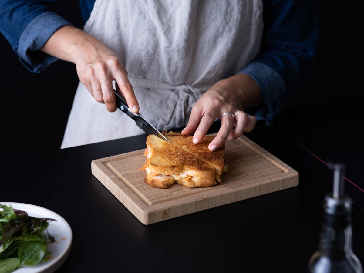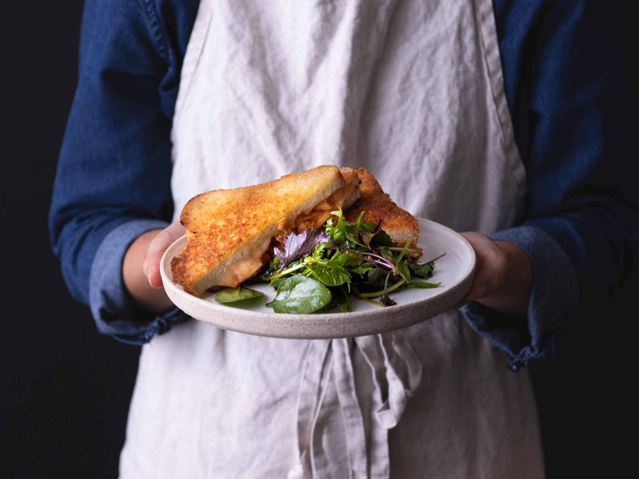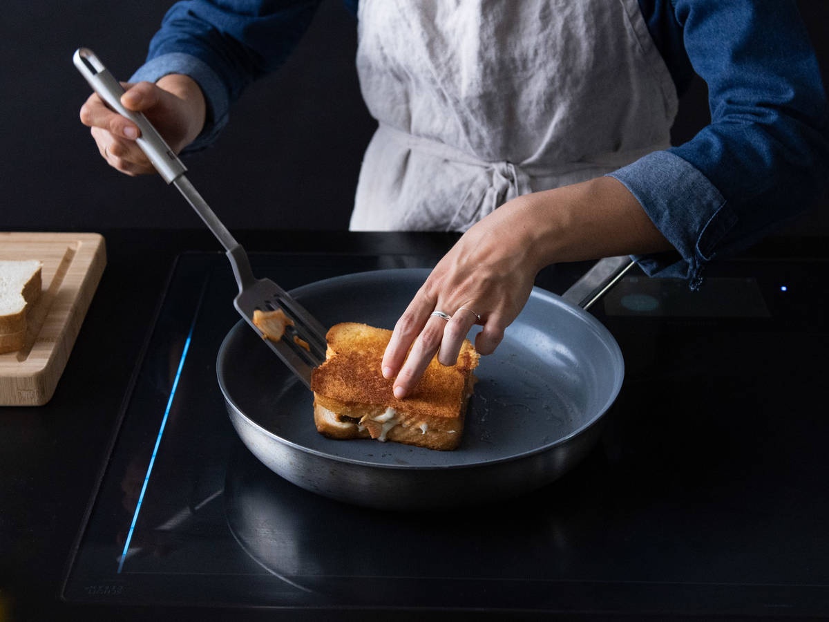 - Khi phô mai đã tan chảy và bánh mì chuyển màu nâu, thêm kim chi lên một lát. Lật miếng bánh mì còn lại lên trên và ấn nhẹ. Nướng thêm khoảng 2 phút và tiếp tục làm tương tự với 2 lát bánh mì còn lại.