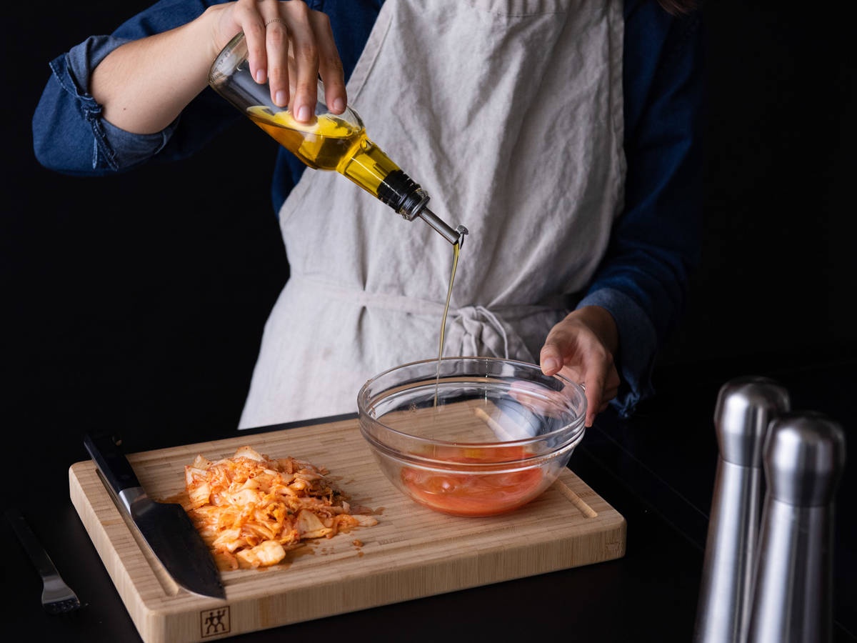 - Vắt hết nước ở kim chi sau đó cắt nhỏ. Trộn nước kim chi cùng giấm gạo, dầu olive để làm nước sốt salad. Nêm muối, tiêu cho vừa vị.