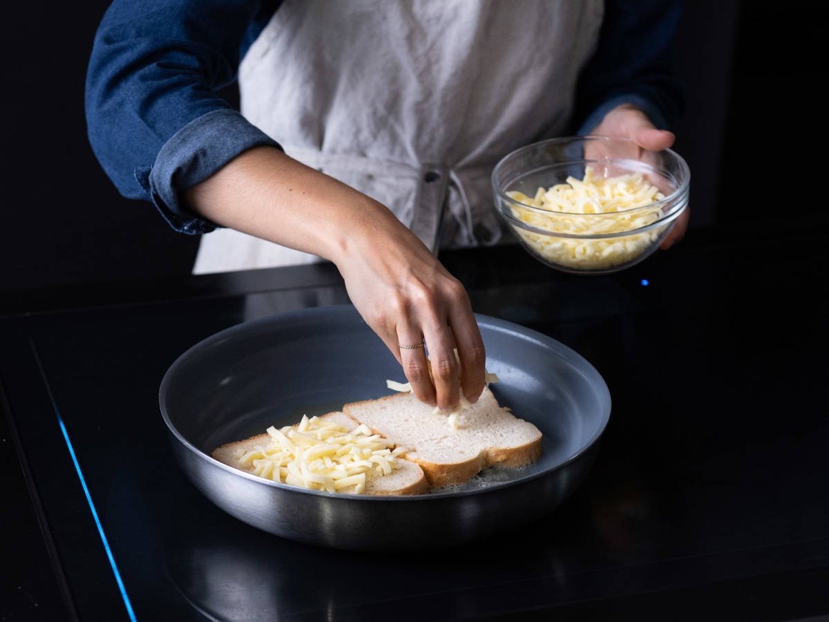 - Cho bơ và dầu olive vào chảo đặt trên lửa vừa. Sau khi bơ đã tan hết, thêm 2 lát bánh mì vào chảo, phủ phô mai bào lên 1/4 mỗi lát bánh.