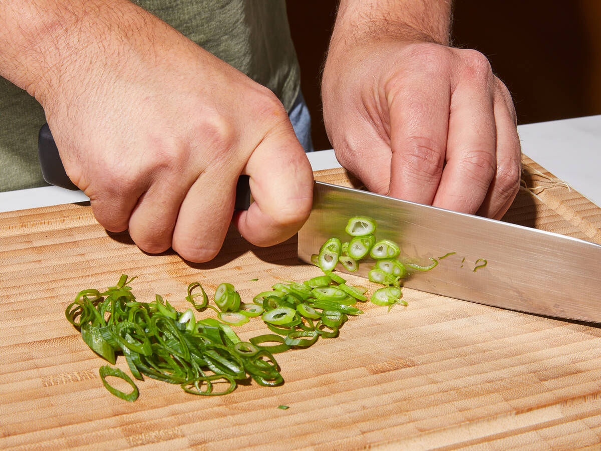 - Hành tây thái nhỏ. Băm nhỏ tỏi và gừng. Cắt kim chi thành từng khúc lớn. Cắt nhỏ hành lá.