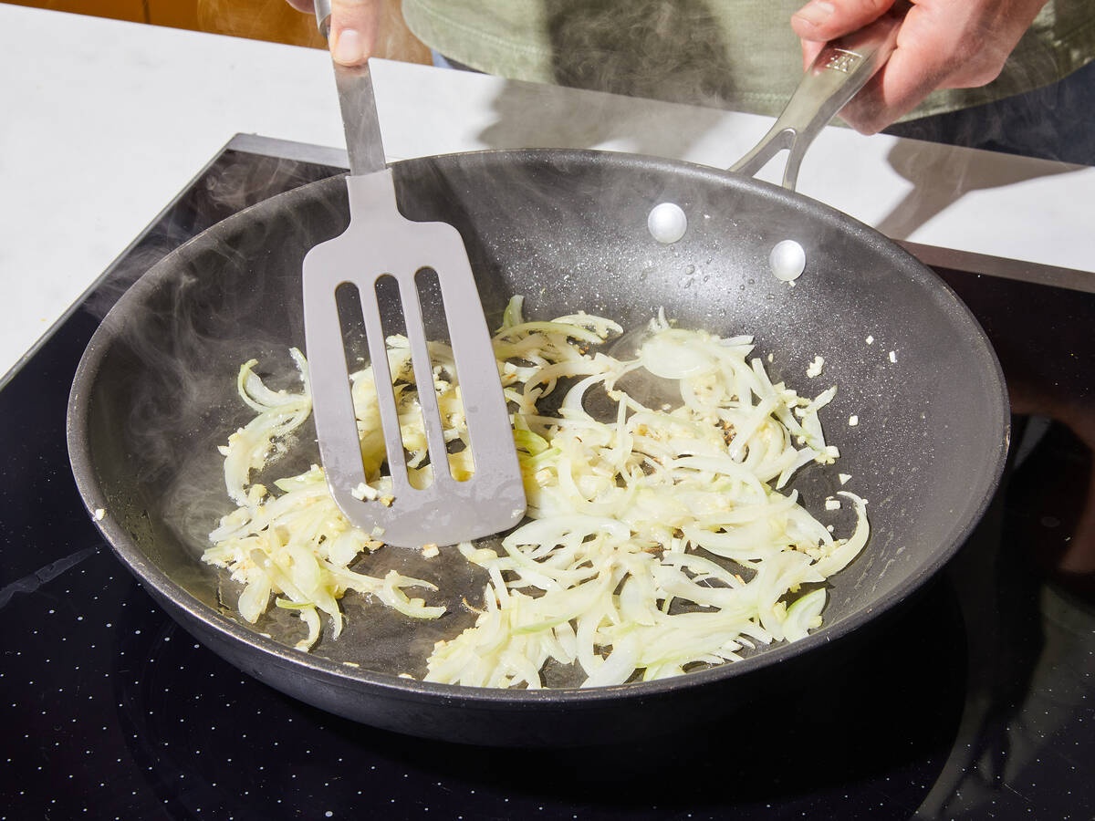 - Sau khi đun chảy bơ trong chảo, thêm hành, tỏi, gừng và đảo đều trong 5 phút.