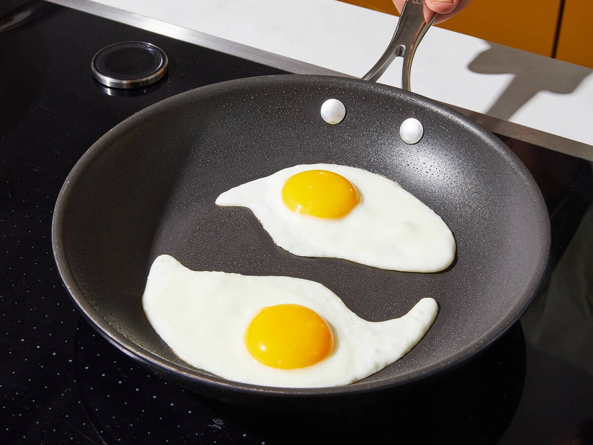 - Trong khi chờ đợi, đun nóng dầu thực vật ở một chảo khác và ốp trứng với độ chín tùy thích.