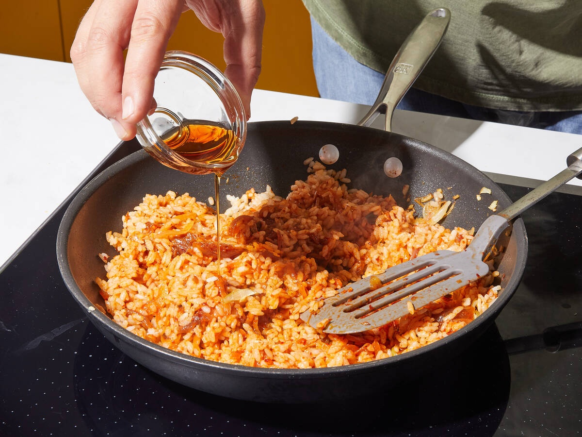 - Cho 3/4 phần kim chi cùng nước cốt vào chảo có hành, tỏi, gừng và đảo đều. Tiếp tục thêm tương ớt và khuấy đều. Sau đó đổ cơm vào, tăng nhiệt độ lên và đảo đều tay. Thêm nước tương, dầu mè và đảo đều lần cuối. Phục vụ cơm ra đĩa và thưởng thức cùng trứng và kim chi.
