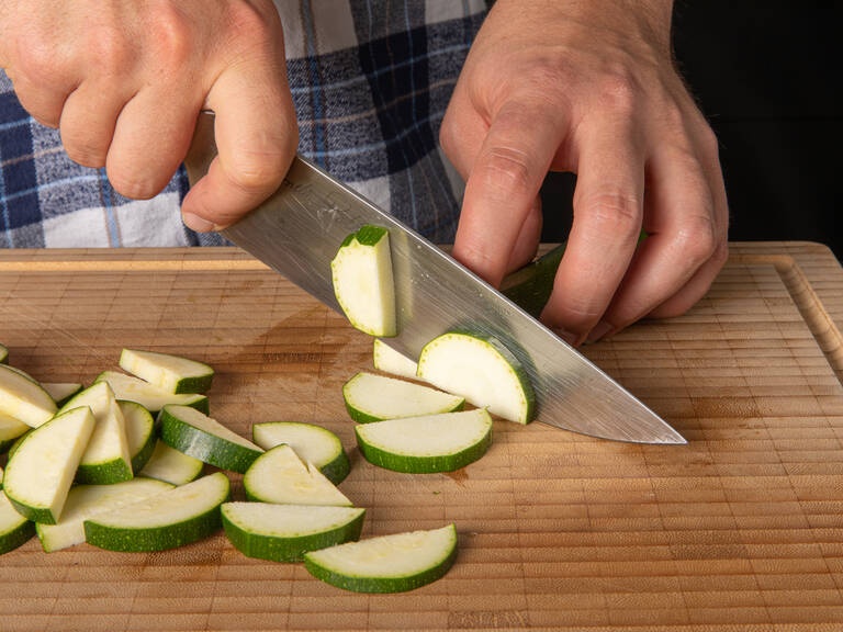 - Băm nhuyễn tỏi. Cắt bí ngòi và khoai tây thành từng miếng vừa ăn. Rửa sạch và cắt bỏ phần gốc của nấm kim châm. Hành lá thái nhỏ.
