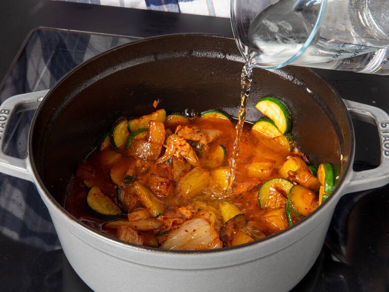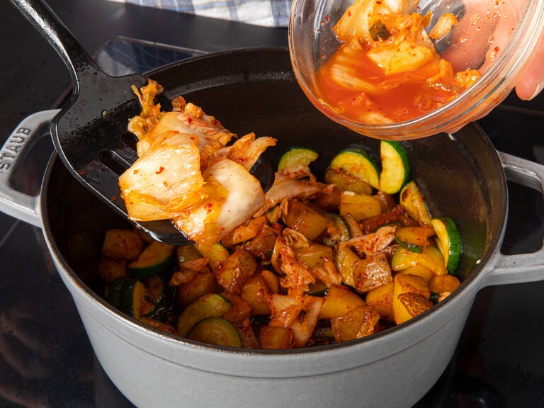 - Thêm dầu thực vật, dầu mè vào nồi và đun nóng trên bếp. Sau đó cho khoai tây vào xào chín trong 5 phút. Thêm tỏi, bí ngòi, tương ớt, kim chi và đun trong 5 phút.