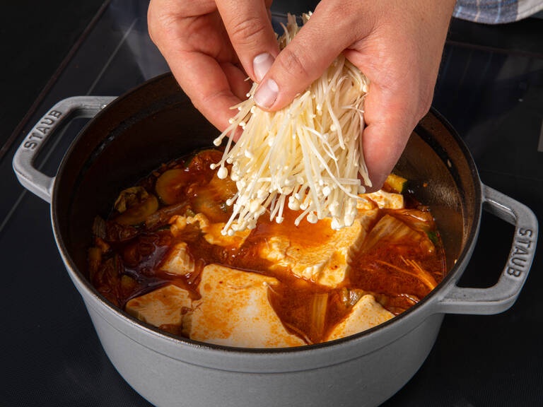 - Thêm đậu phụ vào và dùng thìa cắt thành từng khúc nhỏ hoặc để nguyên. Đồng thời cho nấm vào và nấu thêm 3 phút là hoàn thành. Phục vụ ra bát, thưởng thức cùng cơm nóng.