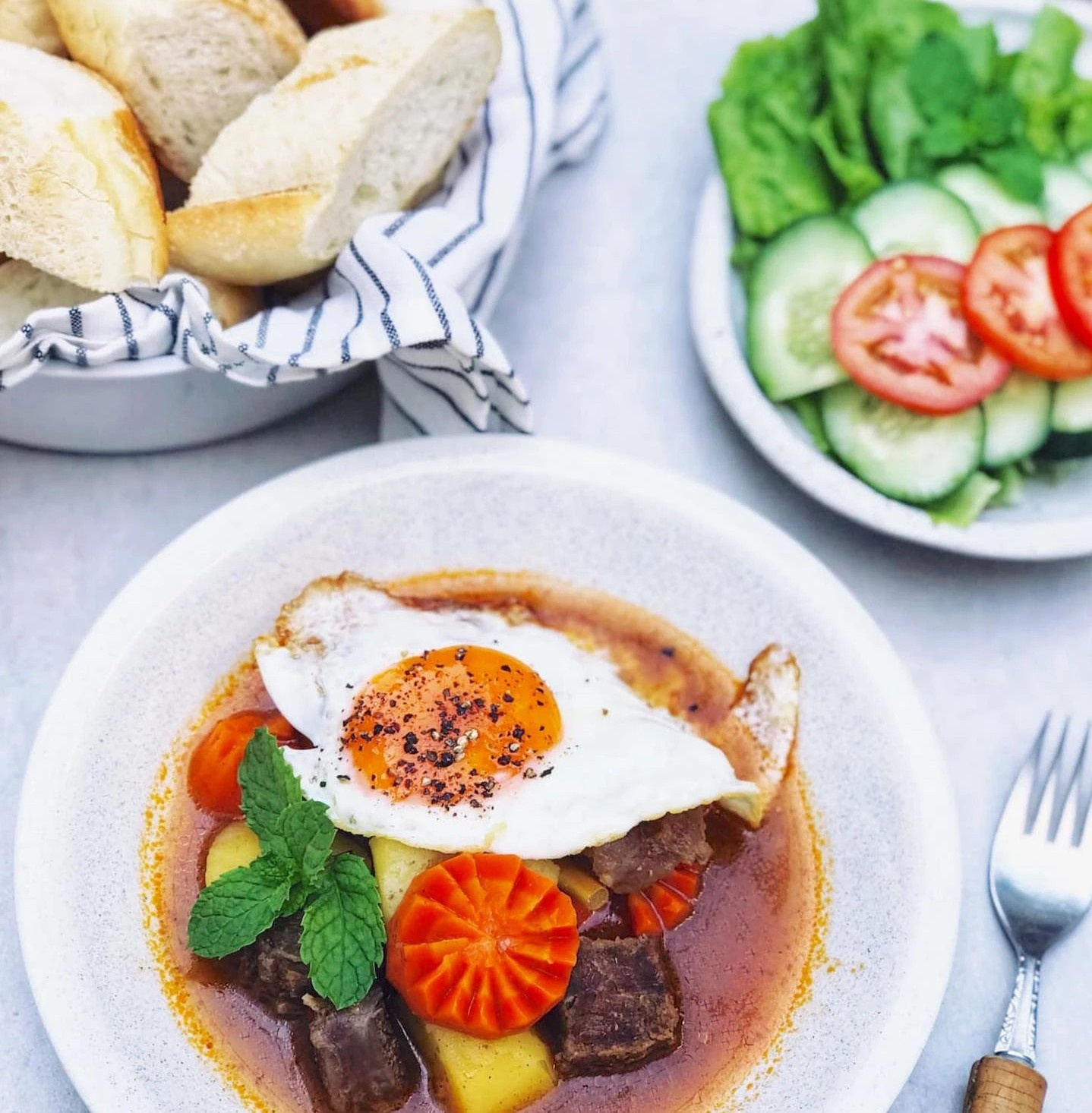 Tôi sử dụng nồi cơm điện, bật chế độ nấu súp để hoàn thiện món ngon này. Nhằm giúp kích thích vị giác và tăng chất dinh dưỡng, tôi thêm trứng ốp la ăn kèm bò kho. Khẩu phần còn có bánh mì, rau xà lách và bạc hà được hái ngay trong khu vườn nhỏ của nhà tôi tự trồng.