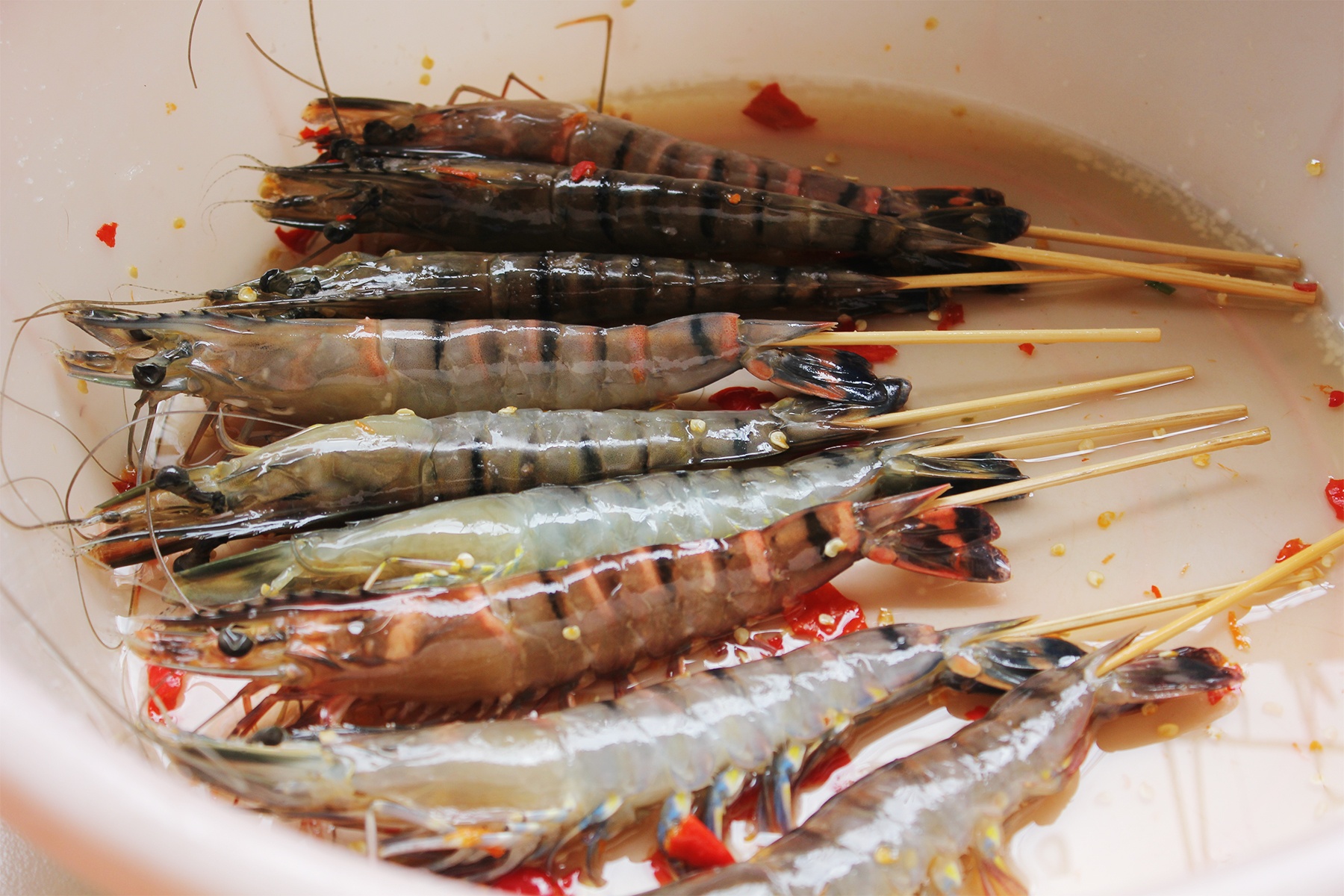 | 2. Tôm nướng muối ớt: Để thực hiện món này cần chuẩn bị các nguyên liệu: 1 kg tôm sú, 1 trái ớt sừng, 5 trái ớt hiểm, 1 muỗng canh muối hột, 1 muỗng cà phê hạt nêm, 1 muỗng cà phê bột ngọt. Thực hiện:Tôm sú cắt bớt râu, rửa sạch, để ráo. Ớt sừng bỏ hạt, cho vào cối giã nát với ớt hiểm. Cho tiếp muối hột, hạt nêm, bột ngọt vào giã nhuyễn. Cho tôm vào thau, thêm hỗn hợp gia vị vừa hòa trộn vào xát đều lên mình tôm, để 15 phút cho thấm gia vị. |