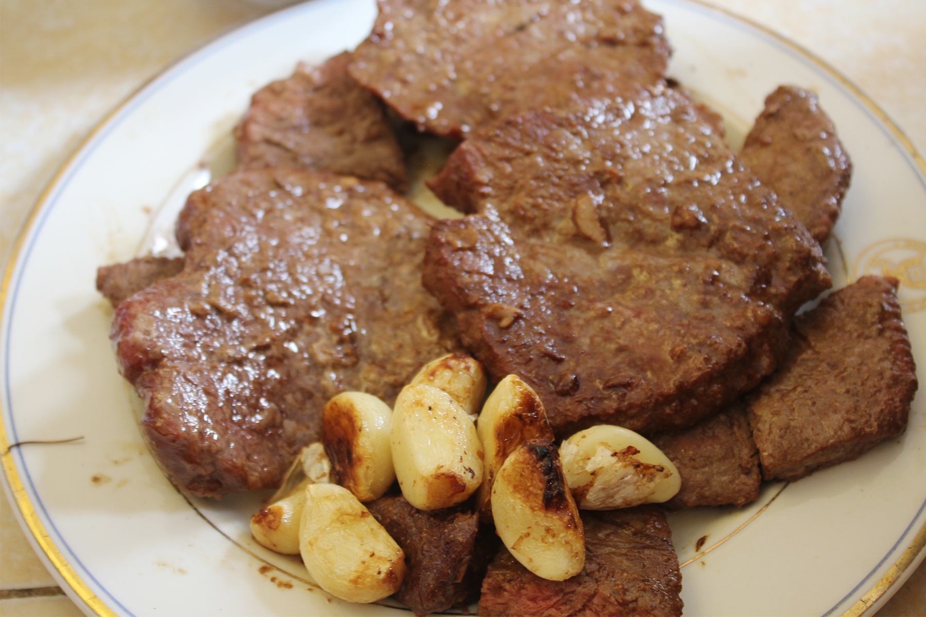 | Bày thịt bò nướng ăn kèm bánh mì và tỏi củ nướng. |