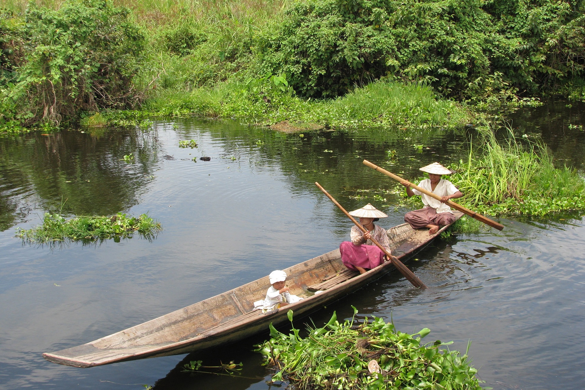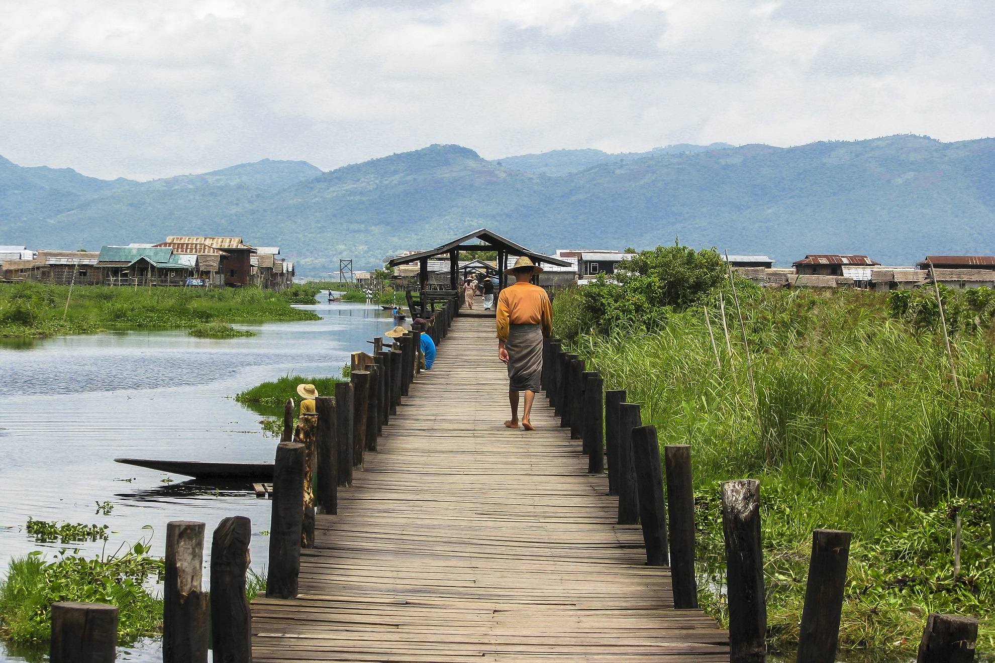 Đến trưa, tôi ghé vào một ngôi làng ven hồ trên cây cẩu gỗ dài hàng trăm mét dẫn ra lòng hồ, thuê một người dân địa phương chèo thuyền tay để tham quan đời sống cư dân. Họ giới thiệu cho chúng tôi về cách thức sinh hoạt, cách trồng lúa, chăm sóc luống rau, hoa màu bằng ngôn ngữ tiếng Anh thật đơn giản. Họ lấy rong rêu dưới hồ, đắp thành những luống để trồng cà chua, mướp đắng (khổ qua).
