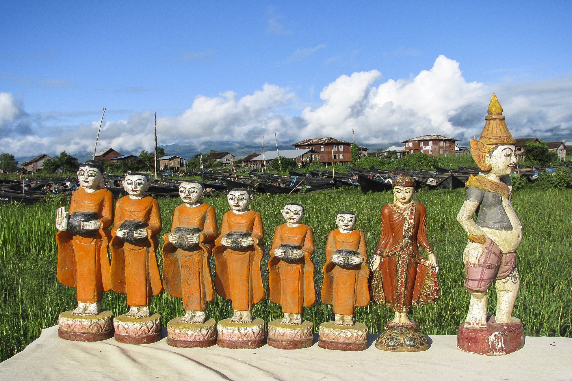 Anh lái thuyền nói bập bõm tiếng Anh, đủ để tôi hiểu này là làng In Dein nằm ở phía tây lòng hồ, với kênh dẫn nước nằm giữa một rừng lau. Bên kia là phiên chợ nổi Ywama sôi động với chu kỳ 5 ngày một lần, với những mặt hàng truyền thống địa phương được bày bán rất phong phú và đa dạng.