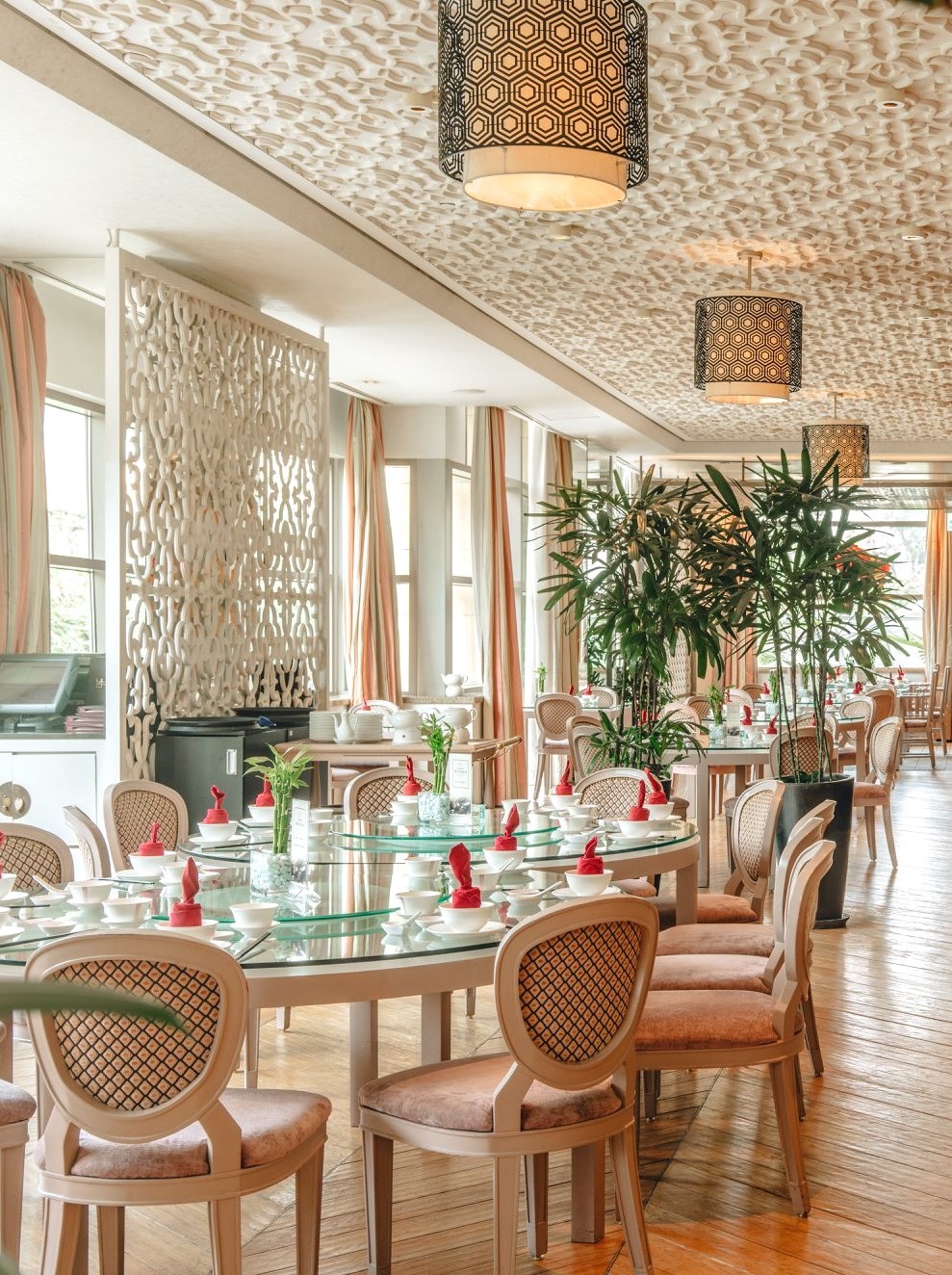 - Lối thiết kế nhà hàng mang tính đương đại, xen lẫn các đường nét, đồ trang trí đặc trưng Trung Quốc. Chỗ ngồi được bố trí khoảng cách hợp lý, cây cối đan xen mang lại cảm giác riêng tư, dễ chịu. Không gian bếp mở giúp bạn dễ dàng quan sát các đầu bếp chế biến món ăn hấp dẫn.