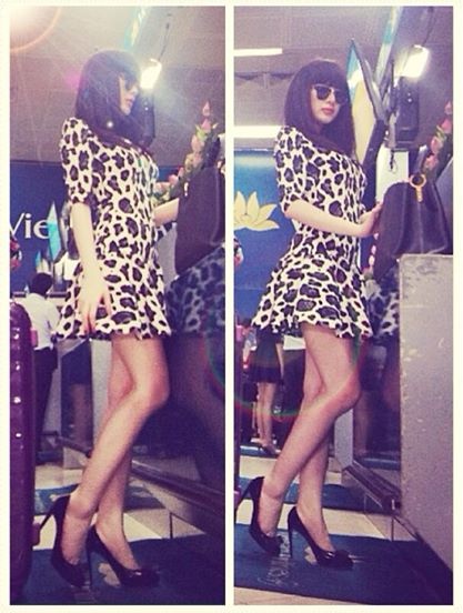 Bộ trang phục có họa tiết da báo hợp xu hướng, thiết kế ngắn khoe lợi thế đôi chân thon dài.